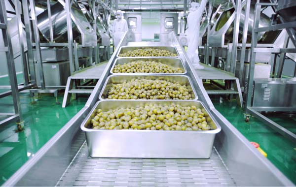 The sugar coated green plum is transported in a channel with the length of 60 meters. No human contact can be found during the transportation. The temperature rises from 60 to 120 degrees, and the high temperature sterilization is completed within 30 minutes. Then enter sterile cooling workshop. It is necessary to complete several links of belt cooling, manual selection twice and metal detector detection to enter the packaging line.